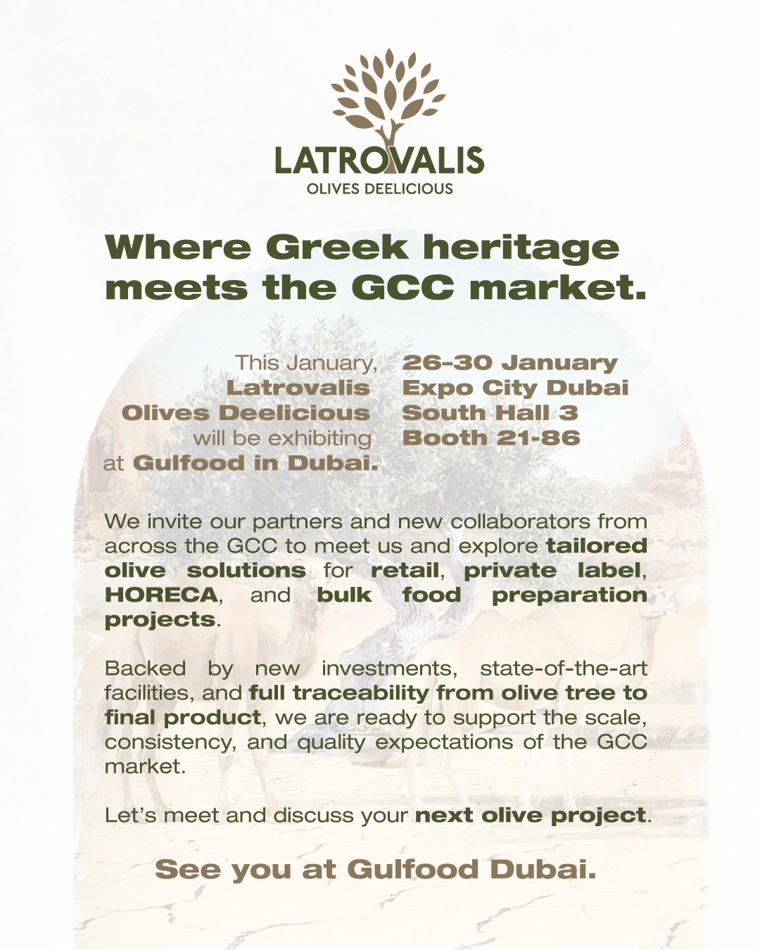 This January, Latrovalis Olives Deelicious will be exhibiting at Gulfood in Dubai.
